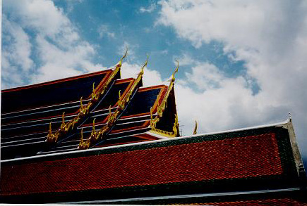 | The picture cannot do the roof justice. Painted clay tiles cover the temple. Carved wood endpieces coated with gold leaf jut from the roof and if you look closely, you can see the small carved gold leaf animals also. |