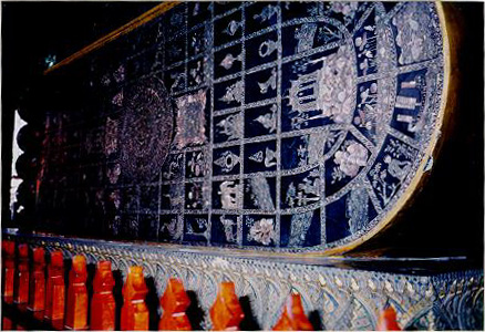 | These are Buddha's feet, or rather, the soles of Buddha's feet. They are all images carved in mother of pearl, or something like that. They're also about six feet tall. |